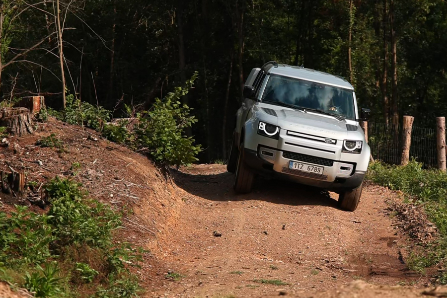 Defender dokáže jen tak, jak je z výroby, brodit až v 90 cm hloubce. Nájezdové úhly jsou 37,5 stupně vpředu a 40 stupňů vzadu. Přechodový úhel vlivem 3 metrového rozvoru je 27,8 stupně. Schopnosti podporuje nastavitelná světlá výška do maxima 291 mm. Systém přepínání jízdních režimů umožňuje zvolit například eco, comfort, sníh, štěrk, trávu, bláto, vyjeté koleje, písek nebo pomalou jízdu po velkých kamenech. Přepínat můžete také redukci nebo uzavírat mezinápravový diferenciál. V terénu si také můžete spustit špičkový kamerový systém s vysokým rozlišením, který pokrývá vše, kam řidič nevidí, a navíc z různých úhlů pohledu. Displej také ukazuje užitečné informace jako je hloubka brodění, křížení náprav nebo aktuální náklon.