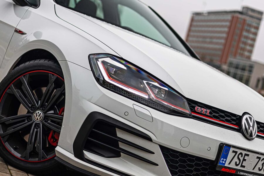Model Golf GTI Performance působí na první pohled nenápadněji než jeho dramatičtější konkurenti, ale přesto umí dát jasně najevo, že jde o sportovní verzi. Typická červená linka v přední masce navazující do LED světlometů, stylové 18″ disky a dvojice koncovek výfuku vytvářejí atraktivní, ale ne přehnaný vzhled.