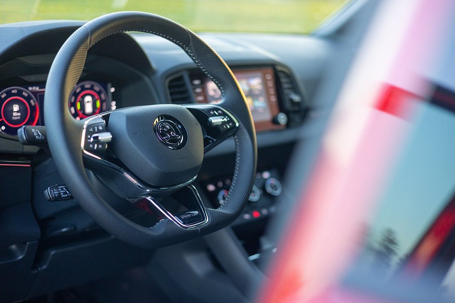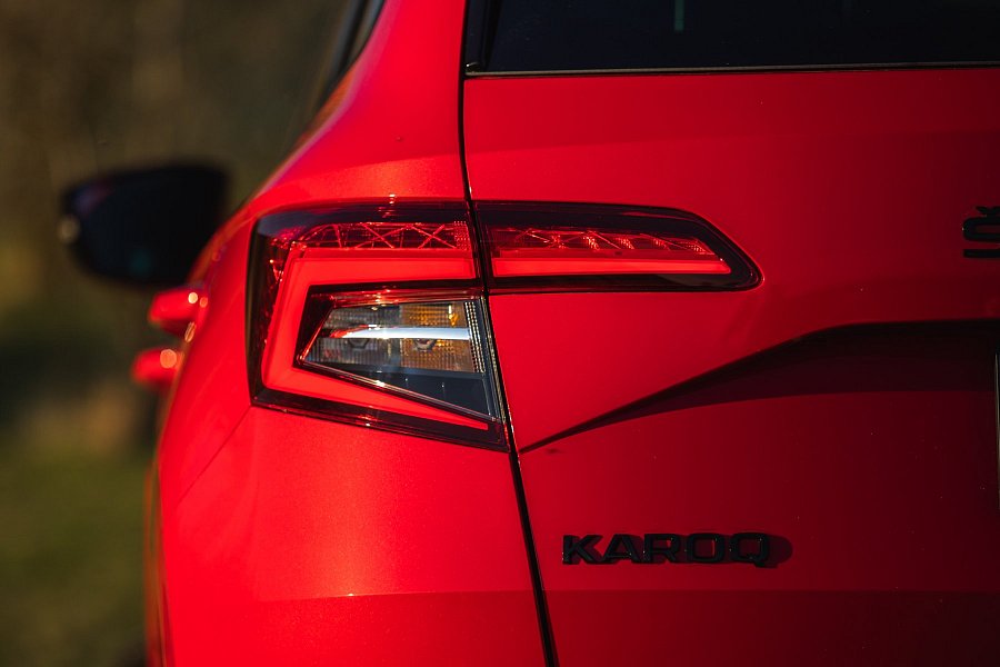 Náš testovaný Karoq je s ozdobnými chromovými prahy, s 19palcovými dvoubarevnými koly, a navíc v žádaném odstínu velvet red, což je krásná červená metalíza. Za tímto autem se s chutí otočíte, je prostě sympatické, a to dokonce ještě víc, než samotná Škodovka čekala.